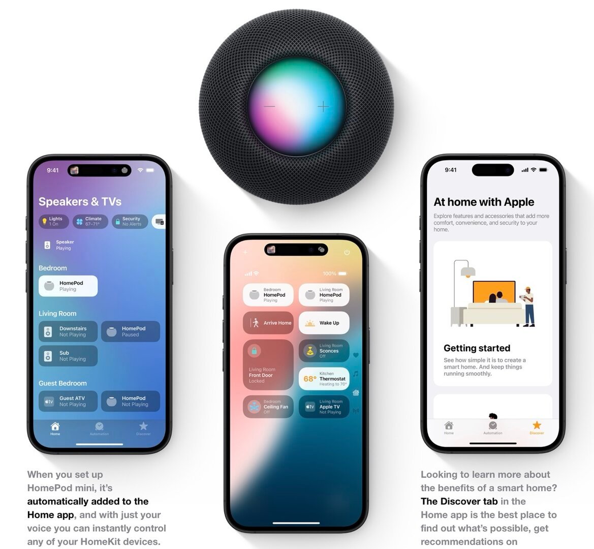Τα HomePods μπορούν να λειτουργήσουν ως Home Hub για Apple HomeKit και να ελέγχετε ήχο, φώτα, κάμερες, θέρμανση κ.α. είδη smart home μέσω Siri (φωνητικές εντολές) ή από μια άλλη Apple συσκευή σας στο σπίτι ή απομακρυσμένα, καθώς και να δημιουργείτε σενάρια (π.χ. να ανάβουν αυτόματα τα φώτα όταν φτάνετε σπίτι).