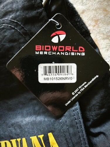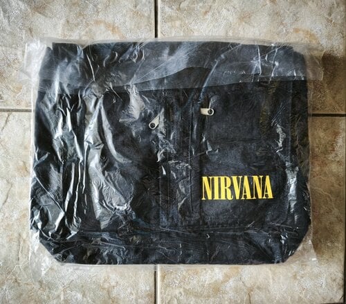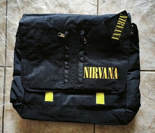 NIRVANA Messenger Bag (2007 UK έκδοση) – Επίσημα αδειοδοτημένη μαύρη νάιλον τσάντα με την επιγραφή "NIRVANA" τυπωμένη στο μπροστινό μέρος και το κλασικό χαμογελαστό λογότυπο της μπάντας τυπωμένο στην πίσω πλευρά, και τα δύο σε κίτρινο χρώμα. Στο μπροστινό μέρος υπάρχουν δύο τσέπες με φερμουάρ, ενώ στο πίσω μέρος υπάρχει μία μεγάλη τσέπη με φερμουάρ, αρκετά ευρύχωρη για ένα μικρό laptop. Η κύρια θήκη της τσάντας περιλαμβάνει μεγάλο αποθηκευτικό χώρο και μια μικρότερη τσέπη με φερμουάρ. Διαθέτει ανθεκτικό μαύρο ιμάντα ώμου και έντονο κίτρινο Velcro για ασφάλεια. Διαστάσεις: 33 x 30 x 13 cm.