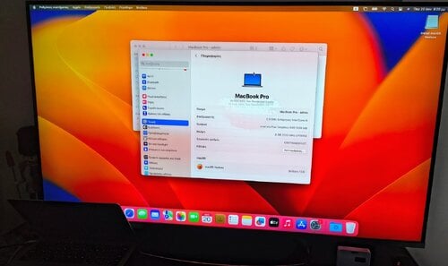 Εγκατεστημένα: mac os Ventura (clean installation). Δεν έχει γίνει σύνδεση με apple id, συνεπώς το laptop είναι έτοιμο για χρήση. (Θα δωθεί προφανώς ο κωδικός πρόσβασης χρήστη).