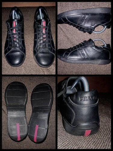 Prada sneakers μαύρα . Νούμερο 8 ( τα αυθεντικά Prada έχουν τέτοια μεγέθη ) . Κάνει σε 42½ - 43 . Αρχική τιμή 650€ . Πωλείται 150€ Sales 130€