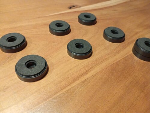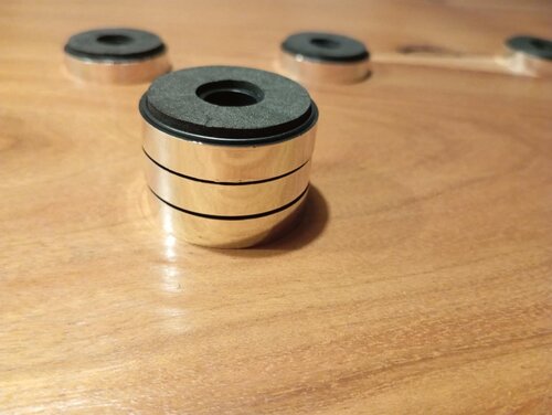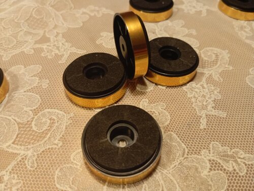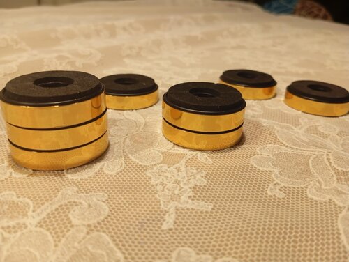 Μπορείτε να τα στιβάξετε αν θέλετε να δώσετε έξτρα ύψος ή γωνία σε κάποιο ηχείο ή έξτρα απορρόφηση. Είναι διαθέσιμα και σε μαύρο χρώμα, ασημί ή χρυσαφί χρώμα. Είναι πολύ καλά για να απορροφούν κραδασμούς από ηχεία στο έπιπλο και εξαφανίζουν ενοχλητικό τρίξιμο και vibrations (κάνουν decouple).