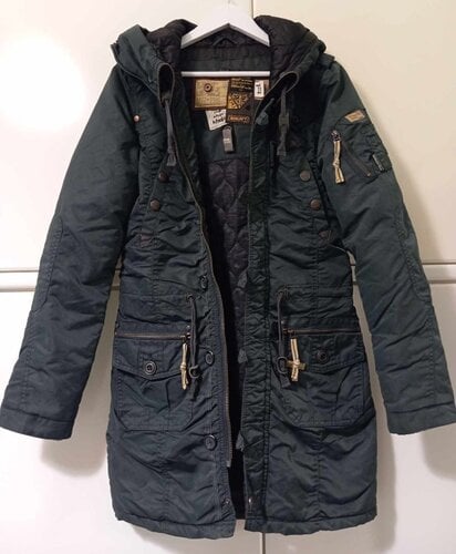 KHUJO γυναικείο ΜΠΟΥΦΑΝ μέγεθος Small σε σκούρο πράσινο χρώμα σε πολύ καλή κατάσταση, προσεγμένο και με λίγη χρήση. Το μπουφάν έχει ενσωματωμένη μεγάλη δική του κουκούλα και δίνεται λόγο μη χρήσης. Τιμή 60€ 40€