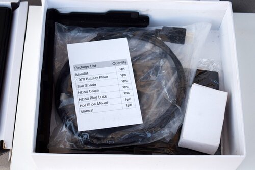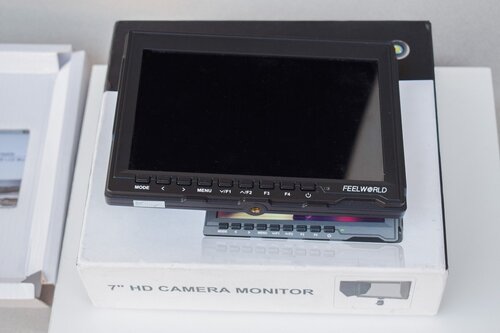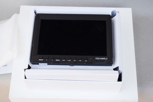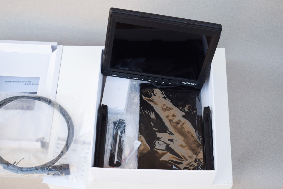 Το FeelWorld FW759, 7" IPS field monitor καινούργιο στο κουτί του με όλα τα παρελκόμενα όπως sun shade, βάση στήριξης κλπ. Η οθόνη φορά το προστατευτικό φιλμ της συσκευασίας.
