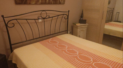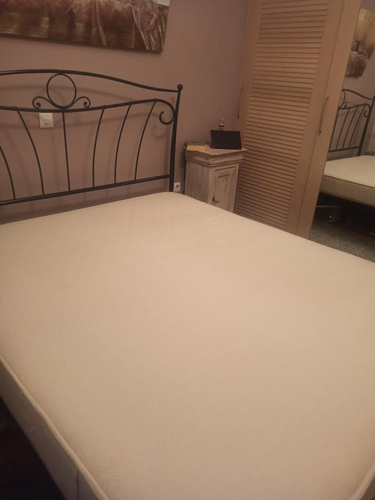 ΥΠΈΡΔΙΠΛΟ King- Size, από σίδερο με περίτεχνο κεφαλάρι στιβαρής κατασκευής (με σανίδες ως βάση στρώματος) χωρίς φθορές καλαίσθητο και εντυπωσιακό. Μαζί έρχεται πίνακας ζωγραφικής (ελαιογραφία) μοντέρνας γραμμής και προσδιορίζει ατμοσφαιρικό ύφος. Διαστ. : στρώματος 1, 80 χ 230 , κεφαλάρι ύψος 60 cm, , πόδι 35 cm, πίνακας 1 , 40 χ 60 , πάχος 5 cm. Το στρώμα περιλαμβάνεται στην τιμή ως δώρο.