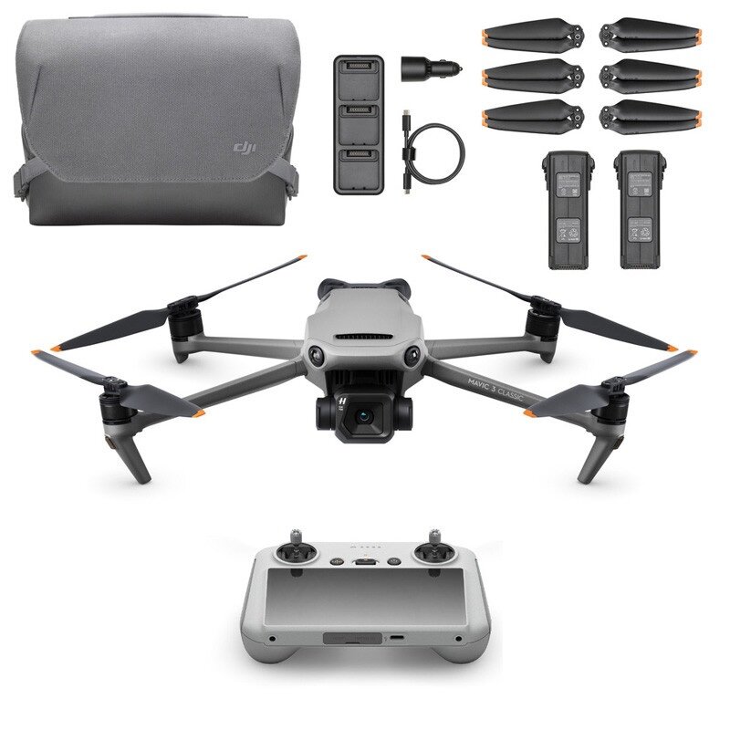 Mavic 3 Classic με τη μονή 4/3 CMOS Hasselblad Camera, με το μεταβλήτο διάφραγμα για κινηματογραφικής ποιότητας video. Ειναι το πακέττο Fly More Combo με το πολυλειτουργικό σακίδιο, τις έξτρα μπαταρίες και φορτιστή (και αυτοκινήτου) , το RC Controller και spare έλικες και τα σχετικά καλώδια usb etc.