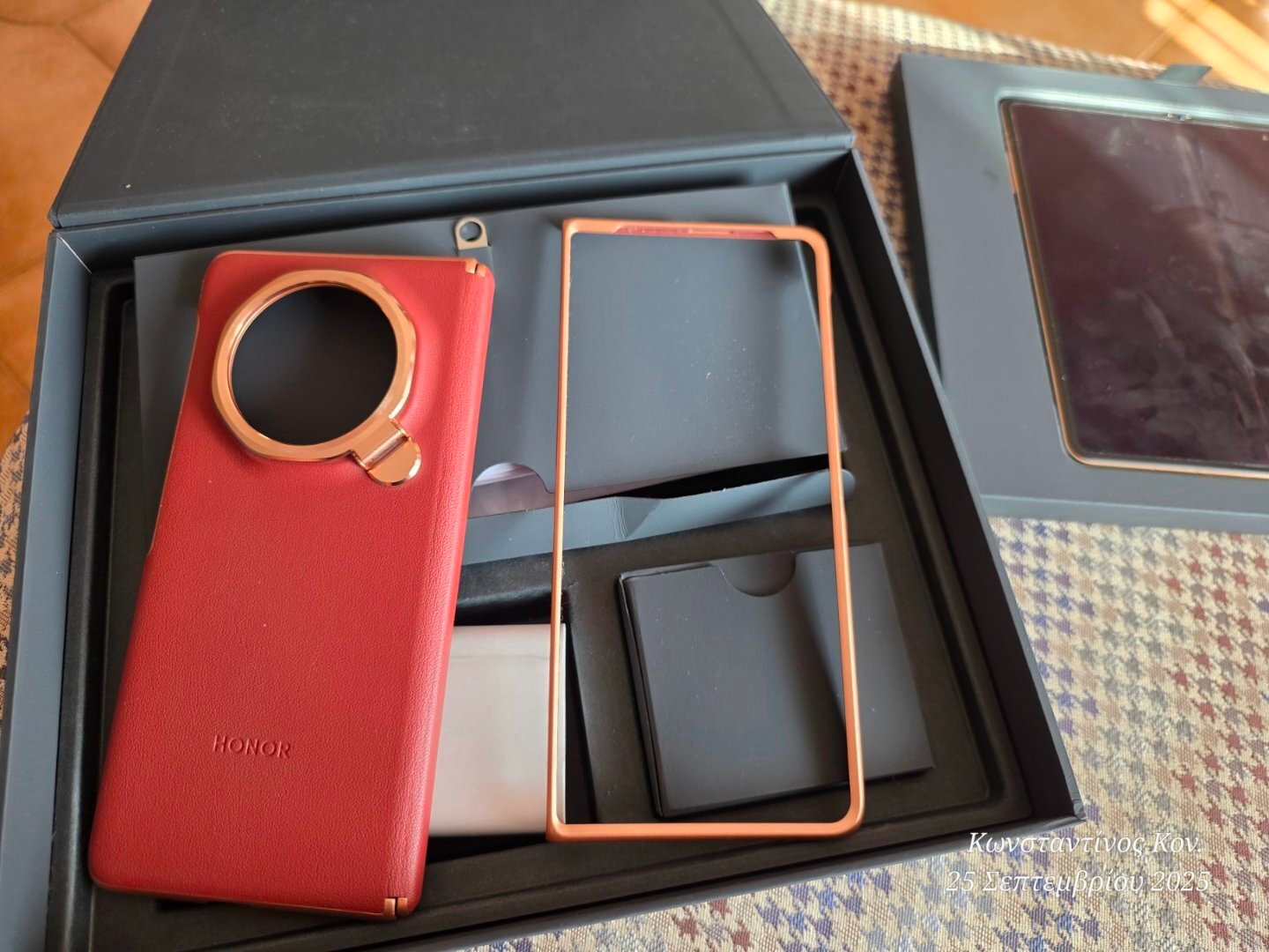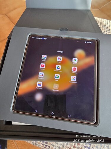 Honor Magic V3 5G Dual SIM (12/512GB) Καφέ , κομπλε στο κουτι του με την αποδειξη του απο Πλαισιο , κατασταση 10/10 σαν καινούργιο , φοραει τις εργοστασιακες ζελατινες σε ολες τις οθονες και εξτρα τζαμακι στις καμερες .