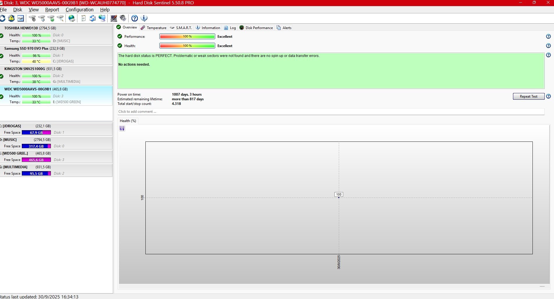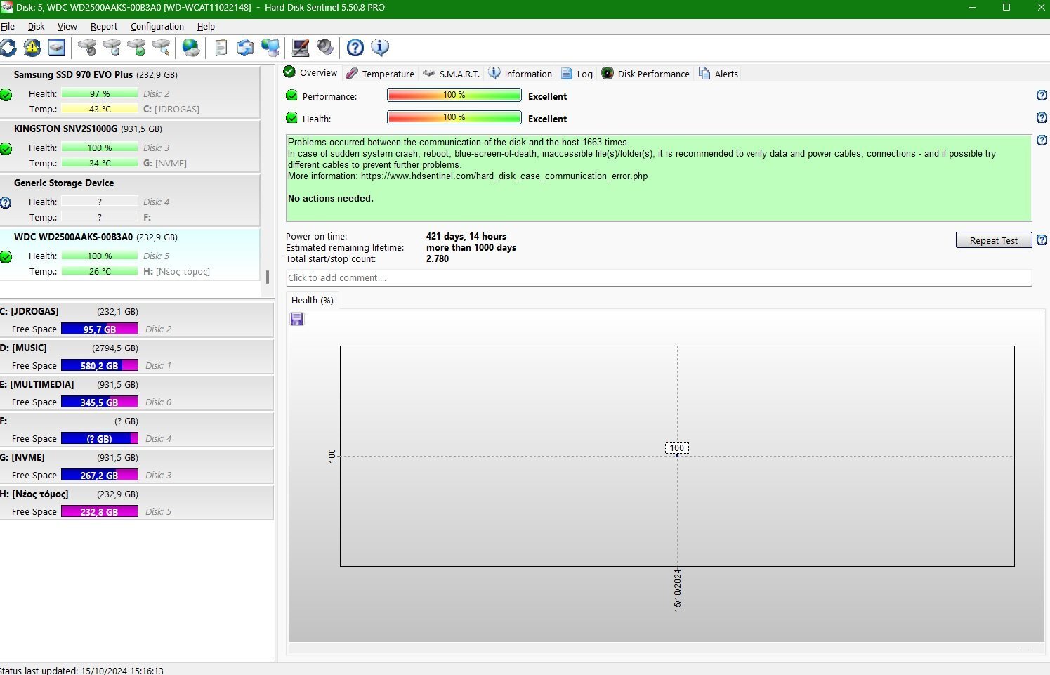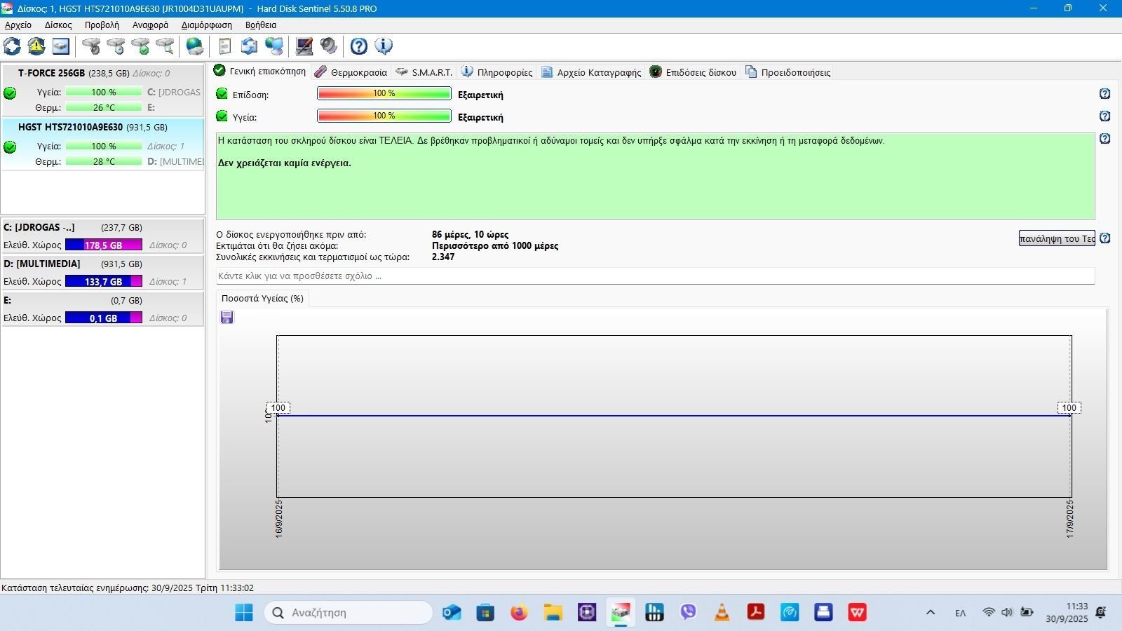 Χωρις bad sectors και με 100% υγεια απο hdsentinel.