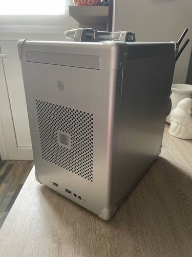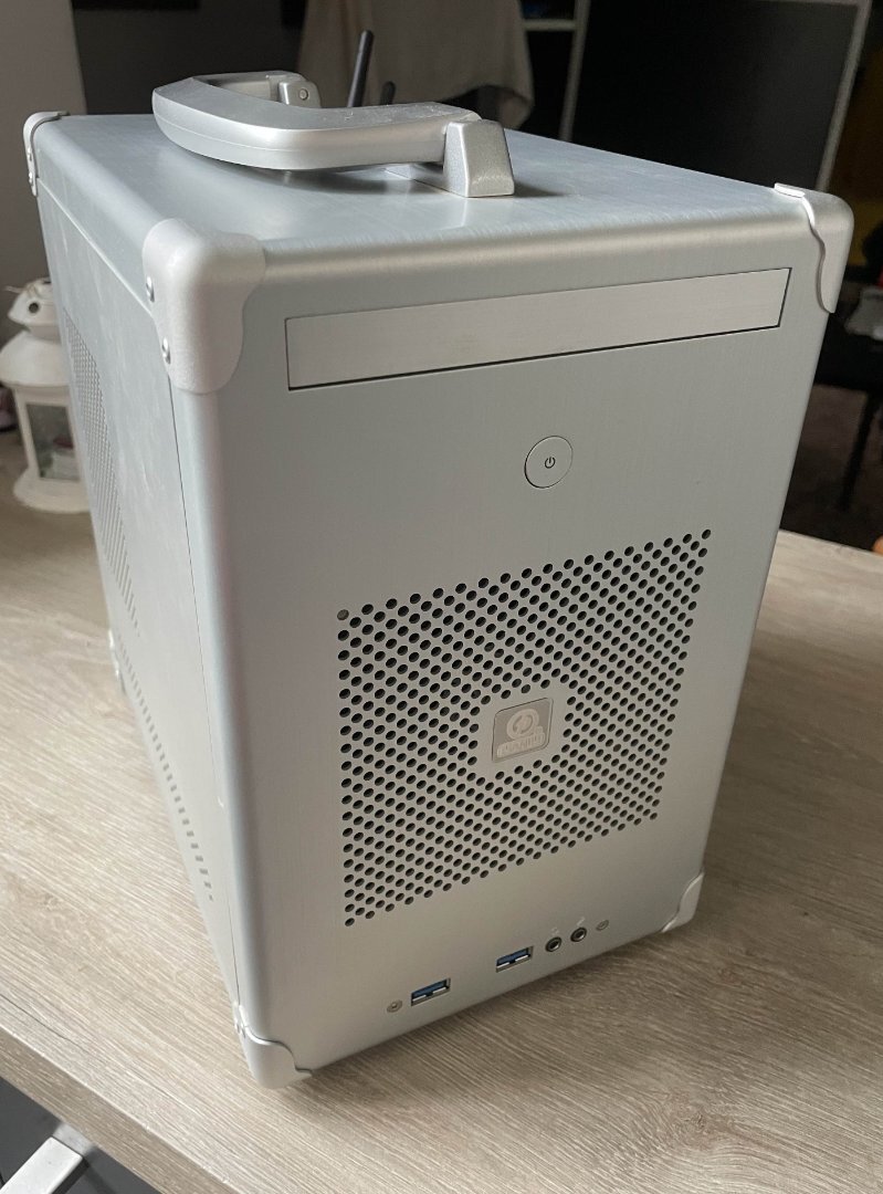 Ένα πολύ ιδιαίτερο και αρκετά σπάνιο κομπακτ κουτί. Το σώμα του είναι απο αλουμίνιο και το χερούλι στο πάνω μέρος πρέπει να είναι απο κάποιου είδους συνθετικό υλικό, Είναι πολύ βολικό στη μεταφορά και φαίνεται σαν ένα μικρό "βαλιτσάκι". Το κουτί είναι σε πολύ καλή κατάσταση με μόνο μερικά σημάδια χρήσης, αν κάποιος θελήσει υπάρχει και ένα τροφοδοτικό της fsp (sfx pro 450W) και μπορεί να δωθεί μαζί με το κουτί στα 90 ευρώ σαν πακέτο.