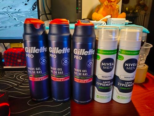 Τρια Gillette Pro Shave Gel + Δυο Nivea Men Sensitive αφροι ξυρισματοs...συνολο 5 φιαλεs...τιμη 13 ευρω