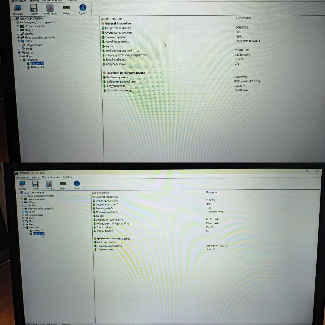 Συμπεριλαμβάνονται 2 μπαταρίες σε πολύ καλή κατάσταση που εξασφαλίζουν παρά πολύ καλή αυτονομία (δείτε photo, γύρω στο 20% φθορά βάσει εξειδικευμένου software). Ο usb type c φορτιστής είναι σε άριστη κατάσταση (μπορείτε να βρείτε πολύ εύκολα φθηνό ανταπτορα με 2-3€ για απευθείας φόρτιση από την power dc-jack θύρα φόρτισης)