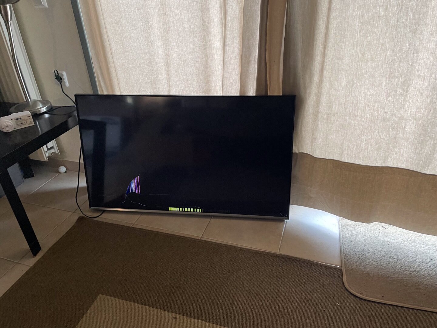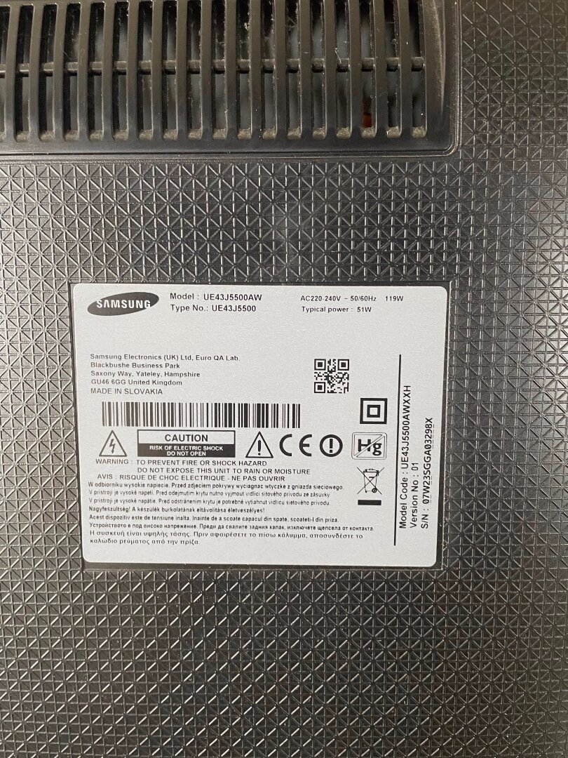 Τηλεόραση Samsung UE43J5500 με σπασμένο panel (κατά τα άλλα δουλεύει κανονικά), για επισκευή ή ανταλλακτικά. Με την κούτα της, συμπεριλαμβάνεται και η βάση επιτραπέζιας τοποθέτησης (αχρησιμοποίητη καθώς η τηλεόραση ήταν τοποθετημένη σε τοίχο) αλλά είναι χωρίς τηλεκοντρόλ.