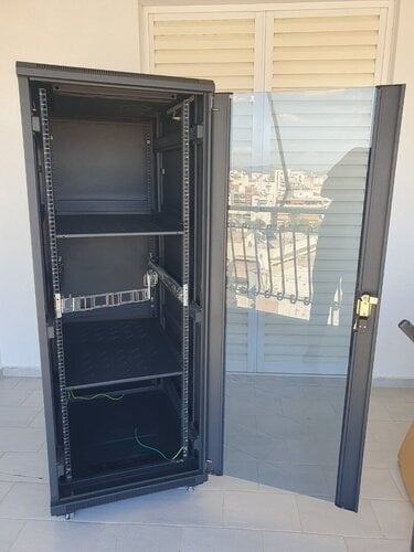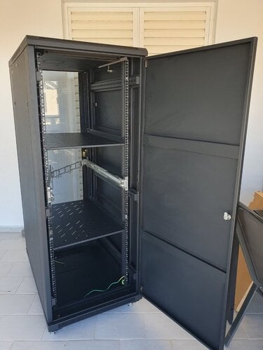 β) Δύο σειρές κατακόρυφων εγκοπών 19" (εμπρόσθια και πλαϊνή) για την τοποθέτηση εξοπλισμού. Η πλαϊνή πλευρά τους μας δίνει την δυνατότητα τοποθέτησης σταθερών και τηλεσκοπικών ραφιών (ύψους 1U) χωρίς να καταλαμβάνουμε ωφέλιμο ύψος από το Rack.