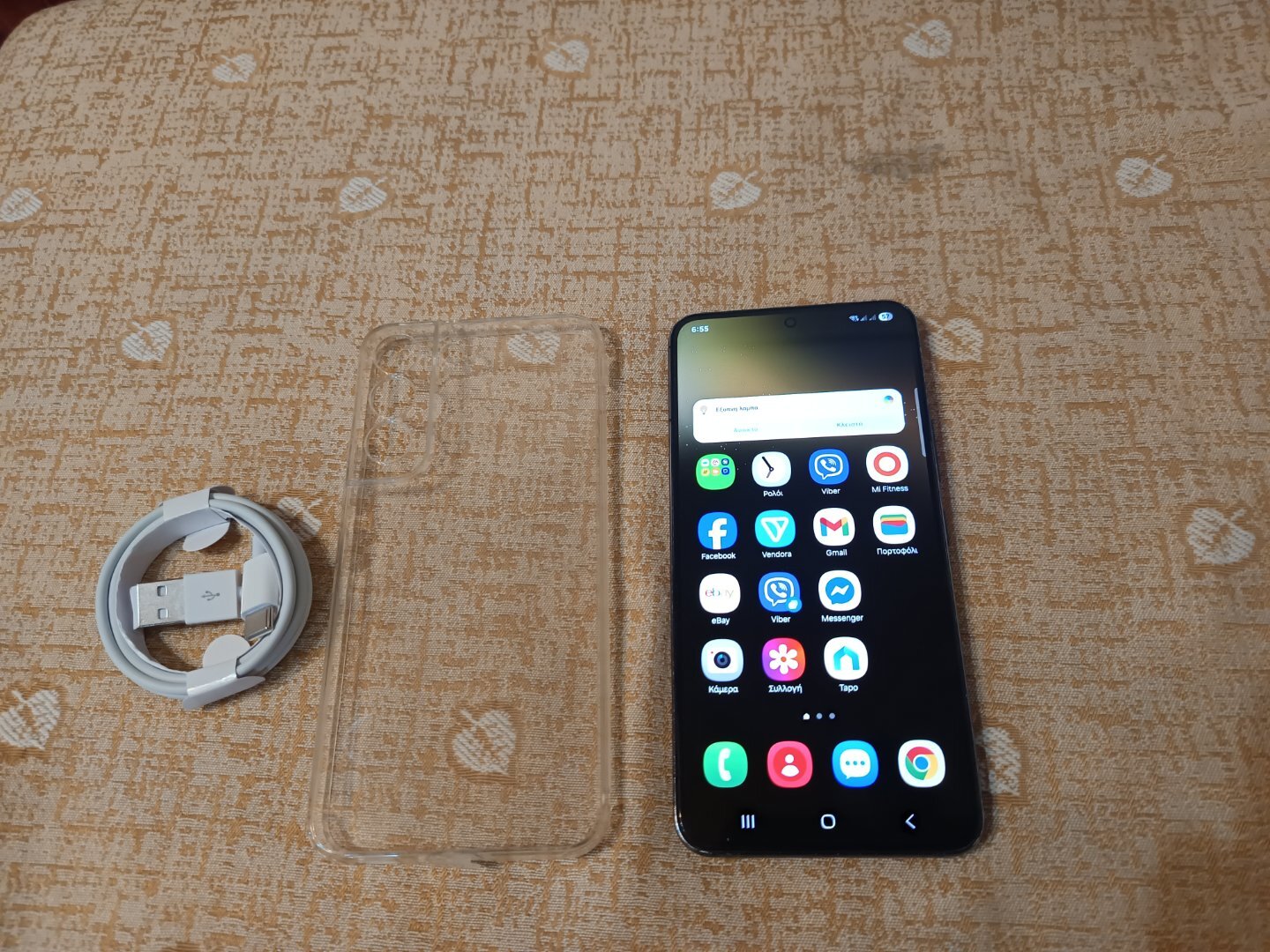 Δίνεται με θήκη πλάτης διάφανη και καλώδιο φόρτισης αχρησιμοποίητο.