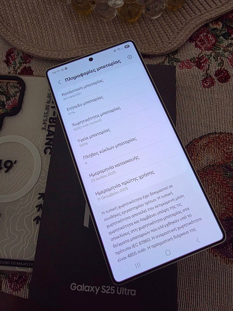 Καλησπερα πωλειται το Samsung S25 ultra 256gb titanium white silvel Ημερων με 4 κυκλους φορτισης κ αποδειξη.Φοραει ζελατινα στην οθονη κ θηκη belkin.Τελος