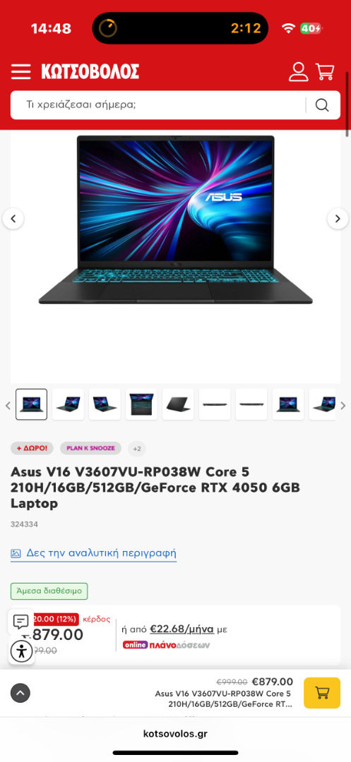 Καινούργιο Asus V16 V3607VU-RP038W Core 5 210H/16GB/512GB/GeForce RTX 4050 6GB Laptop