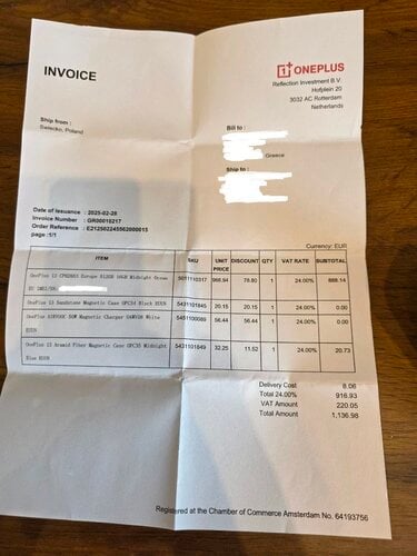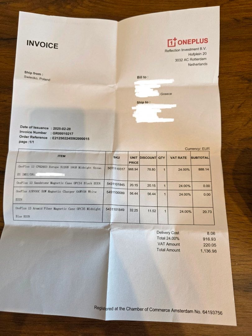 Το κινητό είναι αψεγάδιαστο με μπαταρία 100%, αγορασμένο από το επίσημο site της OnePlus . Φοράει το εργοστασιακό screen protector στην οθόνη. Δίνεται στο κουτί του, με απόδειξη αγοράς καθώς και τα ακόλουθα: