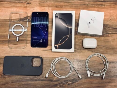 Τι περιλαμβάνει: 1. iPhone 16 Pro Max 256GB Natural Titanium 2. AirPods Pro 2 3. Apple clear case 4. Apple silicon Midnight Case 5. 2 καλώδια φόρτισης 6. Αποδείξεις αγορών για όλα τα προϊόντα