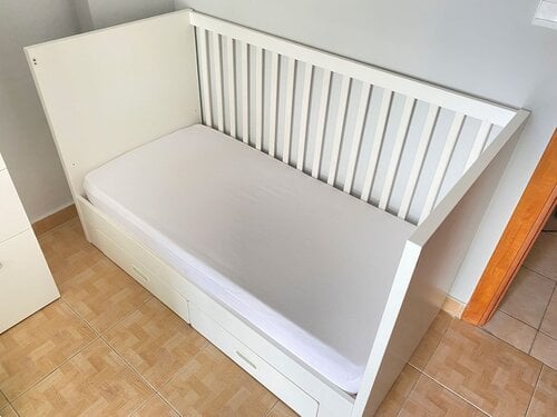 Με τη μία πλευρά αφαιρεμένη και προσθήκη χαμηλής τάβλας, ως κρεβάτι νηπίου, που επιτρέπει στο παιδί να έχει ελεύθερη πρόσβαση στο κρεβάτι και να είναι αυτόνομο. Με μήκος στρώματος 140cm μπορεί να κοιμηθεί άνετα παιδί ύψους μέχρι 120cm που αντιστοιχεί συνήθως έως και τις πρώτες τάξεις του δημοτικού.