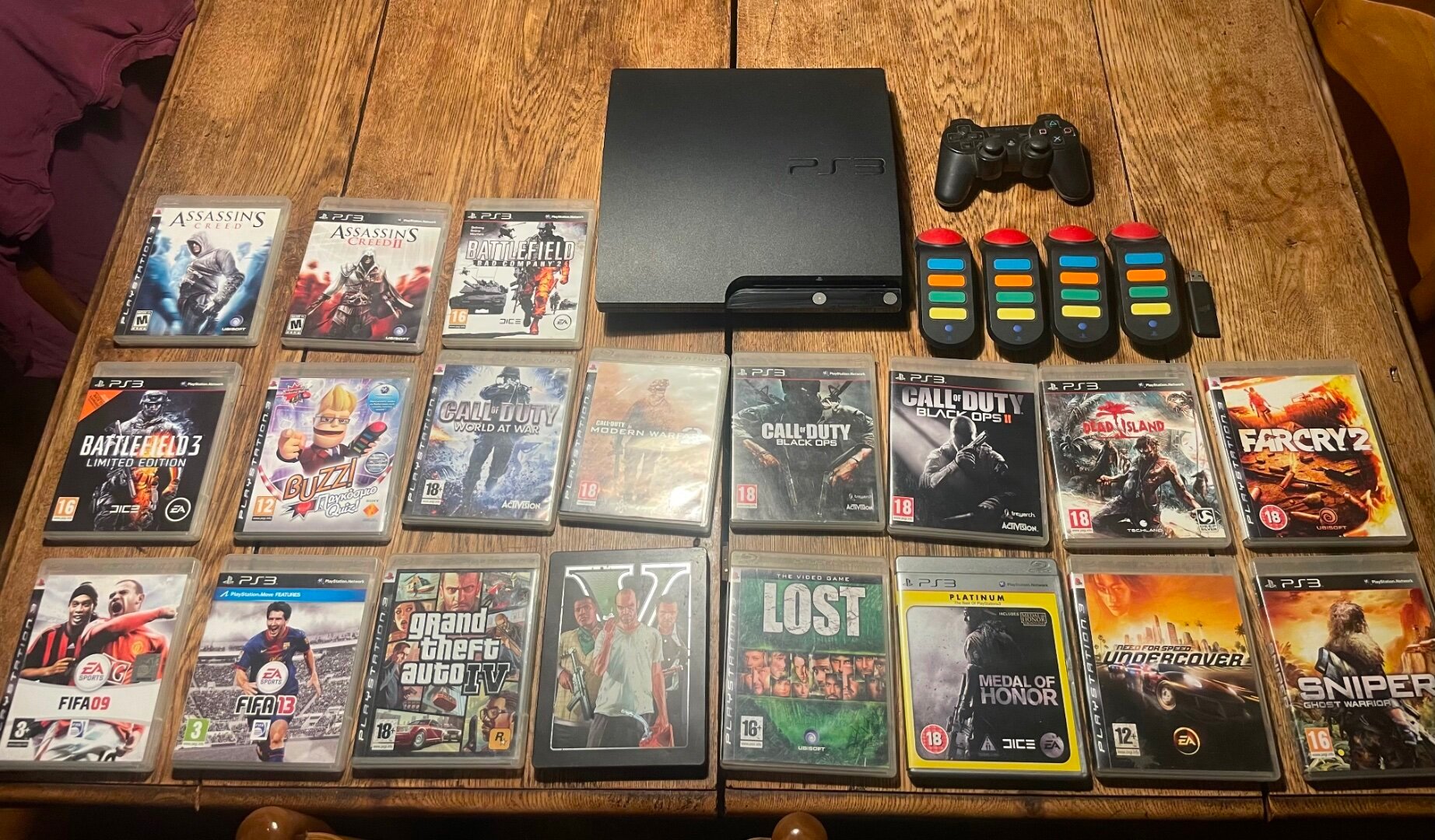 PS3 Slim σε άριστη κατάσταση μαζι με γνήσιο χειριστήριο. Λείπουν κάποια απο τα καλώδια, δίνεται μόνο με καλώδιο ρεύματος και ενα μη-γνήσιο usb. Κουτί και απόδειξη δεν υπάρχει, αγοράστηκε προ 15ετιας. Έρχεται μαζι με 19 games: