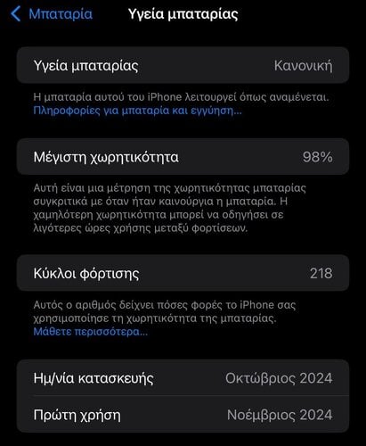 Ποσοστό μπαταρίας 98% (δείτε φωτο). Μαζί δίνεται η απόδειξη-εγγύηση από ελληνικό γνωστό κατάστημα, καθώς και όλο το κουτί και τα παρελκόμενά του. Πωλείται λόγω αναβάθμισης.
