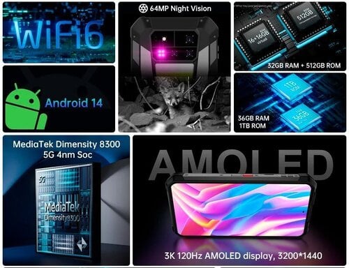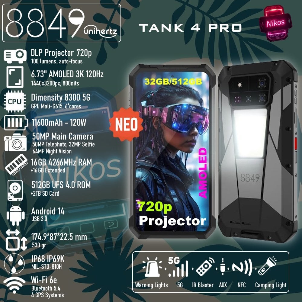 Unihertz 8849 Tank 4 Pro, DLP Projector 720p, Dimensity-8300 5G, 32/36GB 512/1024GB, 11600mAh-120W, 50MP+50MP+32MP & 64MP Night-Vision, Android-14 NFC IP68 Dual-Sim Camp-Light IR-Blaster USB-3.0, AMOLED Rugged Smartphone