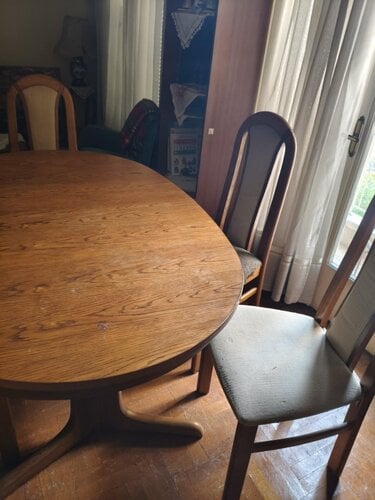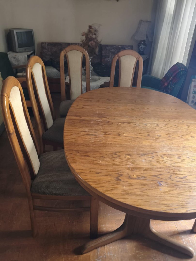 Τραπέζαρια σαλονιού με 5 καρέκλες: Ξύλινο, οβάλ σχήμα, βάση τύπου pedestal. Καρέκλες με επένδυση σε πλάτη και κάθισμα, συνδυασμός ανοιχτού και σκούρου υφάσματος. Ιδανικό για cozy γεύματα ή vintage σκηνικά.