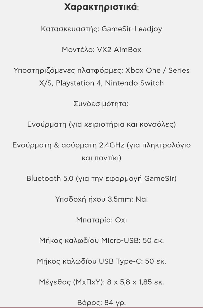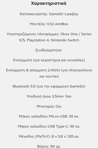 Χάρη στην εξαιρετική ακρίβεια και την ευρεία συμβατότητά του ανάμεσα στις πλατφόρμες το GameSir VX AimBox αποτελεί ένα από τα δημοφιλέστερα συστήματα για τους χρήστες κονσολών προκειμένου να έχουν τον έλεγχο του παιχνιδιού μέσω πληκτρολογίου και ποντικιού. Το GameSir VX2 AimBox επιτρέπει τον πλήρη προσωποποιημένο έλεγχο, σε όποια κονσόλα ή στυλ και αν παίζεις!