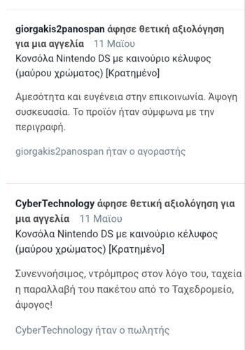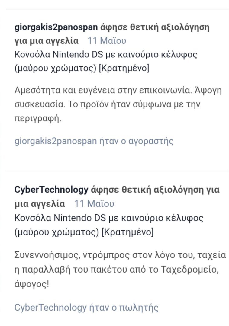 Αγοράστηκαν 15,40€ μαζί μετα μεταφορικά, από GeekOn.gr μαζί με το κέλυφος (https://www.geekon.gr/kapakia-gia-nintendo-ds-mavro). Σε αυτή την αγγελία, σας δίνω ότι βλέπετε στην φωτογραφία μόνο, χωρίς το κέλυφος επειδή το κέλυφος πουλήθηκε μαζί με την μεταχειρισμένη κονσόλα Nintendo DS στον χρήστη @giorgakis2panospan . Η αγγελία είναι για όποιον χρειάζεται αυτά τα ανταλλακτικά της φωτογραφίας. Επίσης, κάποια κουμπιά όπως το "L trigger" και το "R trigger" είναι μεταχειρισμένα από αυθεντική κονσόλα Nintendo DS (original, phat) και κάποια είναι εντελώς καινούρια από τρίτο κατασκευαστή από το Ninetudoo DS Shell όπως βλέπετε στο κουτι. Παράδειγμα, το πλαστικό προστατευτικό καπάκι της εξωτερικής-επάνω-οθόνης είναι καινούριο αχρησιμοποίητο. Σας τα αφήνω στα 1,00€ + 3,50€ μαζί με τα μεταφορικά = 4,50€ με κωδικό ιχνηλάτησης. Για να παρακολουθούμε την πορεία του δέματος.