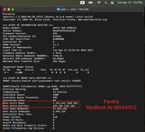 έχει δουλέψει λίγες ώρες, όσο χρειάστηκε για τα updates/upgrades, και μετά παρέμεινε στο συρτάρι (σε standby mode ή σβηστό) αφού έκανα τη δουλειά μου με άλλα Mac (δείτε το screenshot όπου αποδεικνύεται αυτό από το total bytes read/written). Μόλις 2 κύκλοι φόρτισης και υγεία μπαταρίας 100% εννοείται.