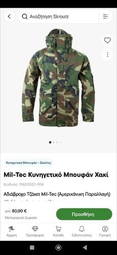 Πωλείται τζακετ στρατιωτικό /κυνηγετικό παραλλαγή της mil Tec. Εντελώς αδιάβροχο δεν περνάει τίποτα. Αν και είναι μπουφαναρα το έβαλα μόνο 2 φορές λόγω λάθος νούμερο. Είναι περισσότερο large . Είναι ουσιαστικά καινούργιο χωρίς καρτελακι. Ευκαιρία για κάποιον που θέλει να το αγοράσει καινούργιο καθώς στο Σκρουτζ το πιο φθηνό έχει 80€. Αποστολή πανελλαδικά.