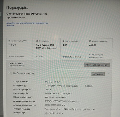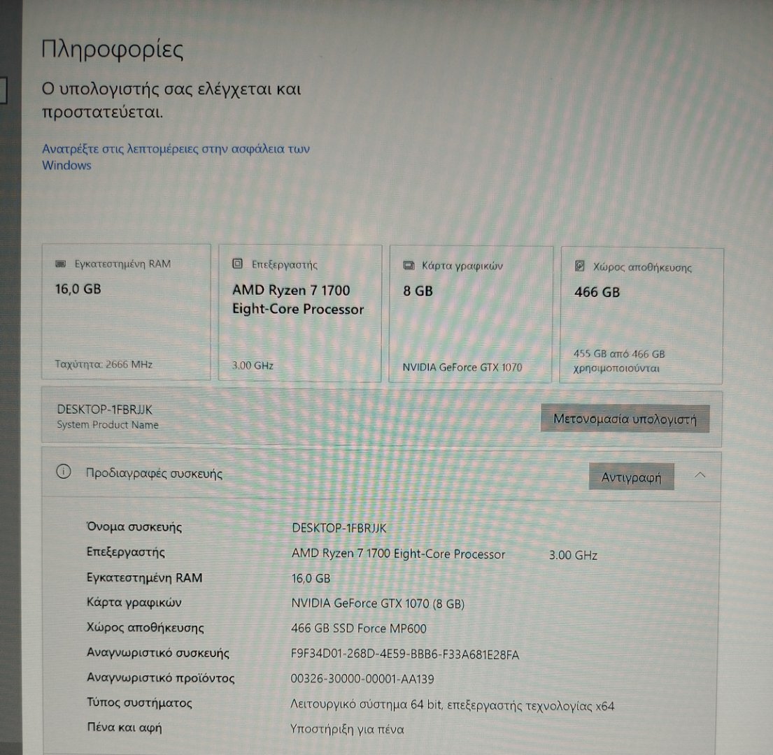 - CPU: AMD Ryzen 7 1700 (8 πυρήνες / 16 threads @ 3.0GHz)