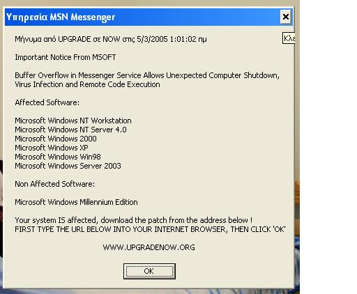 HexStatic Δημοσ. 8 Μαρτίου 2005 Δημοσ. 8 Μαρτίου 2005 Control Panel->Administrative Tools->Services-> Messenger right click , Properties, Startup Type - Set to Disabled. And then Click OK.
