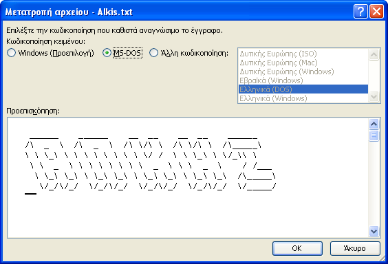 alkisg Δημοσ. 2 Ιουνίου 2005 Δημοσ. 2 Ιουνίου 2005 Στις επιλογές του Word έχει μία ρύθμιση [v] Επιβεβαίωση μετατροπής κατά το άνοιγμα Την τσεκάρεις, και όταν ανοίγεις το αρχείο σου βγάζει διάλογο στον οποίο διαλέγεις κωδικοσελίδα DOS.