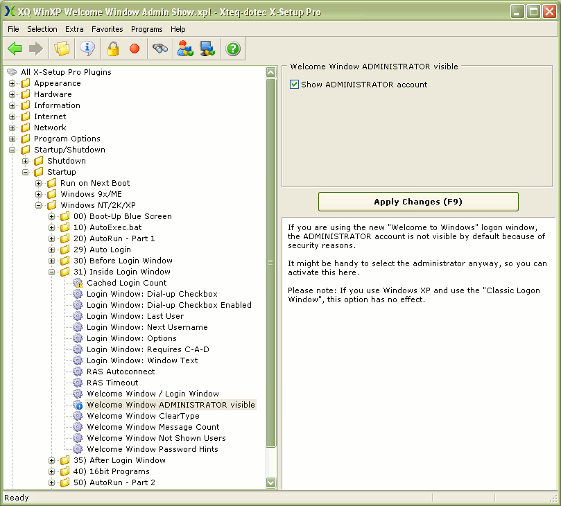 xux99 Δημοσ. 5 Ιουλίου 2005 Δημοσ. 5 Ιουλίου 2005 Μια άλλη λύση είναι η χρήση του δωρεάν προγράμματος X-Setup Pro v6.6. Στην επισυναπτόμενη εικόνα φαίνεται πως ρυθίζουμε το λογαριασμό του διαχειριστή ώστε να είναι ορατός.