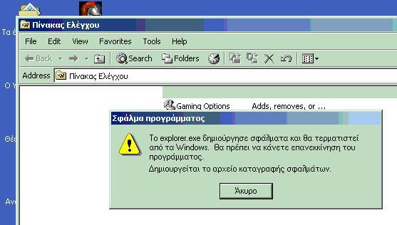 or1onas Δημοσ. 22 Νοεμβρίου 2005 Δημοσ. 22 Νοεμβρίου 2005 Episis, twra mou hr8e sto myalo kati pou eixa pa8ei paliotera k gw: Eixa corrupted ena .cpl arxeio (auta einai ta arxeia pou antistoixoun sta tools tou control panel). Kane loipon ena search sto drive twn windows gia .cpl arxeia k prospa8hse na ta anoixeis ena-ena. Isws kapoio apo auta na einai corrupt k na skasei. An ontws isxyei auto, 8a prepei na kaneis recover to arxeio apo to cd twn windows...
