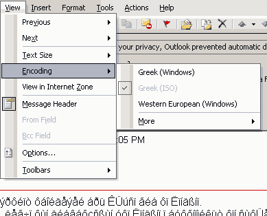 translatum.gr Δημοσ. 24 Νοεμβρίου 2005 Δημοσ. 24 Νοεμβρίου 2005 Τα ελληνικά μηνύματα που μου έρχονται με κωδικοποίηση iso-8859-7 εμφανίζονται σε χαρακτήρες εκτεταμένου ASCII και πρέπει να ανοίξω το μήνυμα και να αλλάξω την κωδικοποίηση σε Greek (Windows). Στα Tools - Options - Mail Format - International Settings - Endoding options - Preferred encoding for outgoing messages έχω βάλει Greek (Windows) [εμ, το ρημάδι είναι μόνο για εξερχόμενα]. Επίσης, στις τοπικές ρυθμίσεις έχω Ελληνικά, το ΛΣ είναι Windows XP. Το αστείο είναι ότι ανοίγοντας το μήνυμα φαίνεται προεπιλεγμένη η κωδικοποίηση Greek (ISO) αλλά επίσης και γκριζαρισμένη (για άγνωστο λόγο). Και στον κώδικα html του μηνύματος υπάρχει η αντίστοιχη ελληνική κωδικοποίηση! <META http-equiv=Content-Type content="text/html; charset=iso-8859-7">
