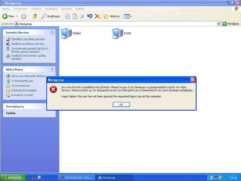 yannis27gr Δημοσ. 18 Αυγούστου 2006 Δημοσ. 18 Αυγούστου 2006 Έχω ένα switch στο οποίο έβαλα στη θέση 1 το ρούτερ, στη θέση 2 το desktop στη θέση 3 το φορητό. Ιντερνετ έχουν και οι 2 κανονικά, φτου να μη το ματιάξω. Όμως, ο σταθερός βλέπει το φορητό αλλά δε συνδέεται μαζί του (δεστε εικόνα) ενώ ο φορητός συνδέεται με τον σταθερό, μπορεί να πάρει αρχείο από τα κοινόχρηστα αλλά δεν μπορεί να του δώσει. Τι σκατά έπαθαν πάλι; Και τα 2 έχουν ΧΡ Pro, με SP1 - Desktop & SP2 - Laptop. Firewall δεν έχει ο σταθερός ενώ ο φορητός έχει το ενσωματωμένο των ΧΡ το οποίο και είναι απενεργοποιημένο.
