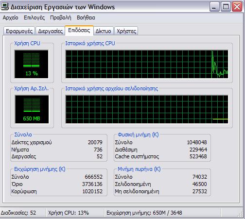 EXARXEIA_CITY Δημοσ. 1 Οκτωβρίου 2006 Δημοσ. 1 Οκτωβρίου 2006 an exeis xp tote auta aplononte oso ram k na tous baleis k meta an tin xrisimopiisoun oli tote xrisimopioun k to swap fileara den iparxei logos na anisixeis wgw me 1 Gb ram k idle katastasi exw 400kati Mb free 610Mb xrisimopiounte 3038Mb dia8esima giati rwtas ? sou fenete problima? Για κοιτα και στο task manager την physical available memory. Απλά και free ram να εχεις το page file χρησιμοποιείτε...