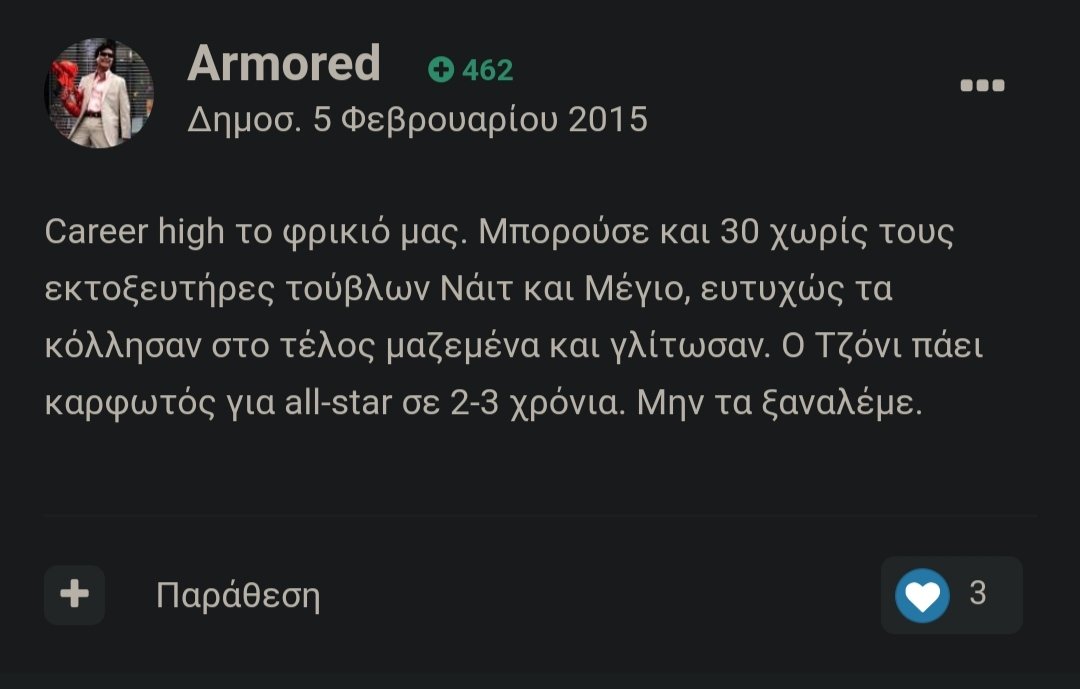 Armored Δημοσ. 21 Ιουλίου 2021 Δημοσ. 21 Ιουλίου 2021 Που να ξέραμε τότε, βάζαμε τον πήχη στο all-star ενώ ο άλλος είχε χαράξει πορεία ήδη για την κορυφή. Το πώς εξελίχθηκαν όλα είναι έτοιμη ταινία για Όσκαρ δεν χρειάζονται καν σάλτσες και κοψίματα.
