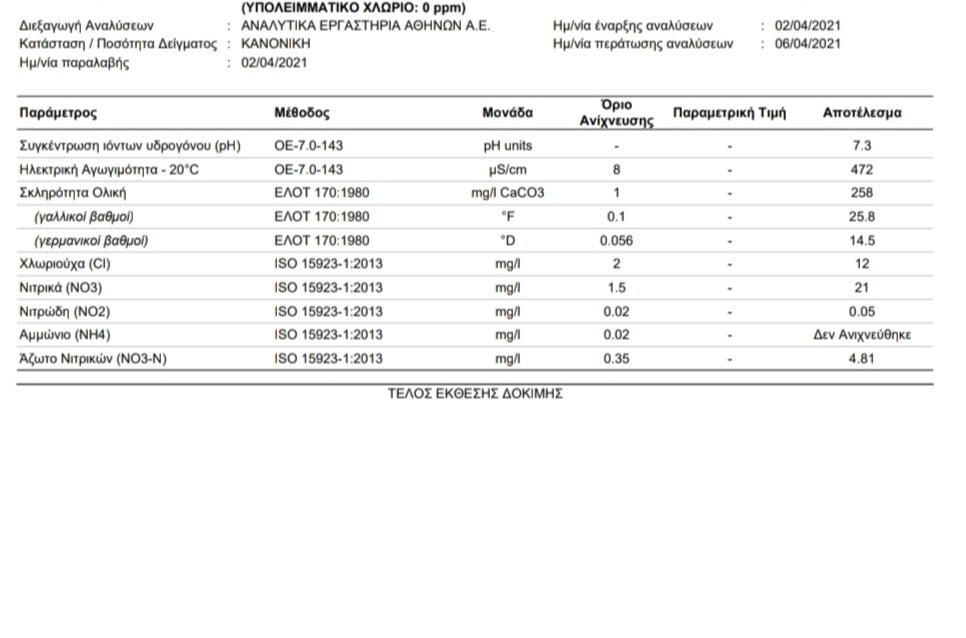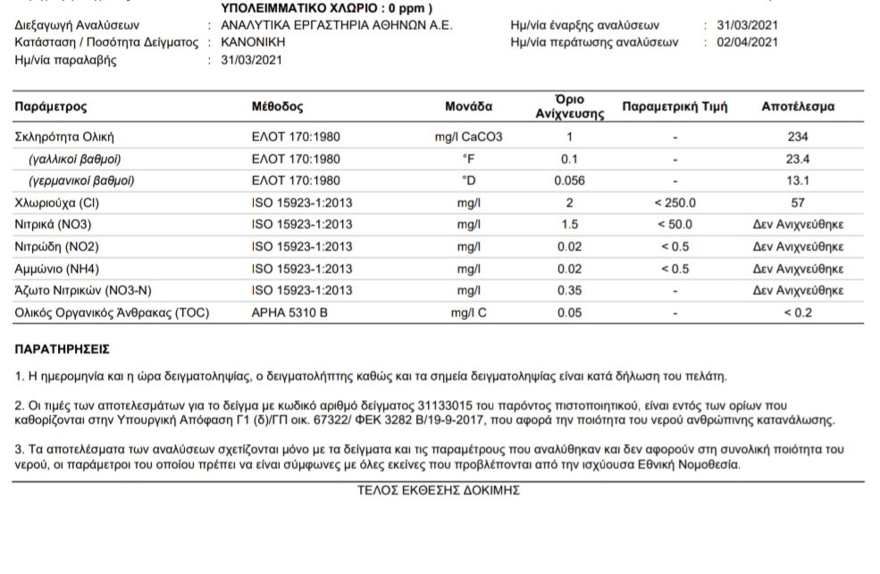 mix82g Δημοσ. 7 Απριλίου 2021 Δημοσ. 7 Απριλίου 2021 Λοιπόν μόλις μου ήρθαν τα αποτελέσματα από την ανάλυση που έκανα. Για να σας δώσω να καταλάβετε λόγο του ότι έχω λιγα νιτρικά (τον Σεπτέμβρη είχαμε 27mg/l τώρα 21mg/l ) έβαλα σαν πρώτο φίλτρο ανταλλαγης ιόντων για νιτρικά και σαν δεύτερο έβαλα φίλτρο άνθρακα για όλα τα άλλα. Τα αποτελέσματα είναι ότι δεν ανιχνεύεται καθόλου τα νιτρικά. Ως τώρα όλα καλά. Όμως λόγο του ότι το φίλτρο αυτό δουλεύει με ανταλλαγή ιόντων δλδ ανταλλασει ιόντα νιτρικών με ιόντα χλωρίου έχω αυξημένα χλωριούχα(ιόντα χλωρίου). Με λίγα λόγια κατακρατεί τα νιτρικά και στέλνει ιόντα χλωρίου στο νερό. Βλέπω ότι τα χλωριούχα(ιόντα χλωρίου) έχουν εκτοξευτεί στα 57. Ενώ ήταν στο 12.το όριο βέβαια είναι 250. τα φίλτρα άνθρακα δεν μειώνουν τα χλωριούχα δλδ τα ιόντα χλωρίου και μειώνουν μόνο το υπολειμματικο χλώριο αυτό δλδ που υπάρχει στο δίκτυο δλδ το χλώριο που βάζουν από τον δήμο και από τις διάφορες υπηρεσίες για να είναι καθαρό το νερό από μικρόβια.σας στέλνω τις αναλύσεις από την βρύση συγγενικού μου προσώπου που φαίνεται πόσα νιτρικά και χλωριούχα έχει και την δική μου ανάλυση που έχει εξαλείψει εντελώς τα νιτρικά. Επόμενη μέτρηση σε 5 μήνες που πρέπει να αλλαχτεί και το φίλτρο νιτρικών για να δω πόσα νιτρικά περνάνε. Στην πρώτη φωτογραφία είναι του συγγενικού μου προσώπου που μένει δίπλα μου , και στην δεύτερη φωτογραφία είναι από το νερό μου με το φίλτρο ρητίνης. Εγώ πριν 2 μήνες στην βρύση μου με έδειξε 23mg/l νιτρικα 1