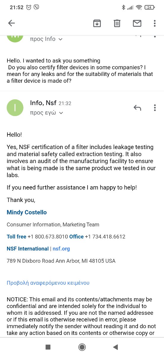 mix82g Δημοσ. 12 Απριλίου 2021 Δημοσ. 12 Απριλίου 2021 Επανέρχομαι για να απαντήσω σε κάτι που είχε ειπωθεί πριν λίγο καιρό . Δηλαδή ότι ο NSF δεν πιστοποιεί συσκευές. Τους έθεσα ερώτηση αν πιστοποιουν και συσκευές για τυχόν διαρροές , για την καταλληλότητα των υλικών κτλ και σας στέλνω την απάντηση μεταφρασμενη για όσους δεν γνωρίζουν αγγλικά και απο κάτω screenshot το μήνυμα που με έστειλαν: Ναι, η πιστοποίηση NSF ενός φίλτρου περιλαμβάνει έλεγχο διαρροών και ασφάλεια υλικού που ονομάζεται δοκιμή εξαγωγής. Περιλαμβάνει επίσης έναν έλεγχο της κατασκευαστικής μονάδας για να διασφαλιστεί ότι αυτό που κατασκευάζεται είναι το ίδιο προϊόν που δοκιμάσαμε στα εργαστήρια μας. Όπως καταλαβαίνετε οι έλεγχοι που κάνουν είναι κάτι παραπάνω από το να ελέγχουν ένα φίλτρο για ποιες ουσίες μειωνει μόνο. Ιδίως μεγάλο ενδιαφέρον έχει η τελευταία παράγραφος. Με αυτή την διατύπωση αντιλαμβάνομαι ότι πολλές εταιρείες μπορεί να δώσανε ένα καλο δείγμα για έλεγχο ώστε να πάρουν πιστοποιηση , και στην αγορά να βγάλανε ένα πιο οικονομικό και μικρότερης κατασκευαστικής και δυναμικής φίλτρο. Γι'αυτον τον λόγο χρειάζονται εντατικοί έλεγχοι ώστε να μην επιτραπούν τέτοια παρατράγουδα από διάφορες εταιρίες.
