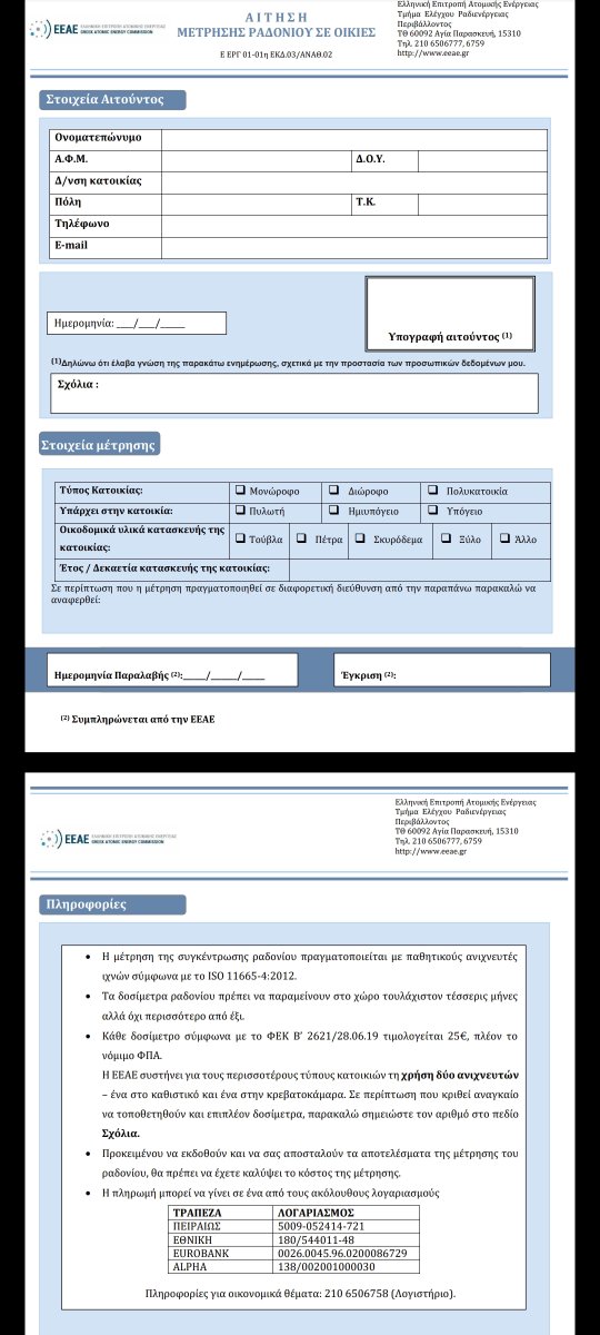 tarantules Δημοσ. 15 Απριλίου 2021 Δημοσ. 15 Απριλίου 2021 42 λεπτά πριν, mix82g είπε Μπορείς να κάνεις αίτηση στην ΕΕΑΕ μέσω της ιστοσελίδας τους και να σε στείλουν ένα δείγμα για έλεγχο στο ραδόνιο. Το έκανα εγώ γι'αυτό στο λέω. Τα τοποθέτηση σε δύο σημεία μέσα στον χώρο που θες να ελέγξεις για 6μηνες και τα στέλνεις στην ΕΕΑΕ για ανάλυση μετα. Είναι δωρεάν όλο αυτο. Το λέω όχι μόνο για εσενα αλλά για όποιον θέλει να κανει έναν έλεγχο στο σπίτι του ή αλλού.Υπάρχουν περιοχές με πολύ υψηλά ποσοστά ιδίως σε υπόγεια κτλ. Κατέβασα την αίτηση και δυστυχώς δεν είναι δωρεάν.Συστήνουν λέει τουλάχιστον 2 δοσίμετρα που το καθένα κοστίζει 25€+ΦΠΑ και για τα αποτελεσματα της μέτρησης πρέπει να πληρώσεις.Έχει και αριθμούς λογαριασμού τραπέζης.