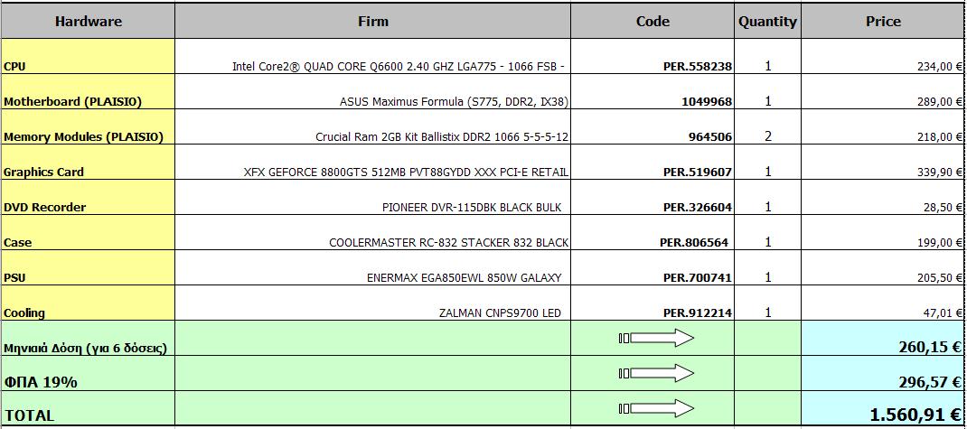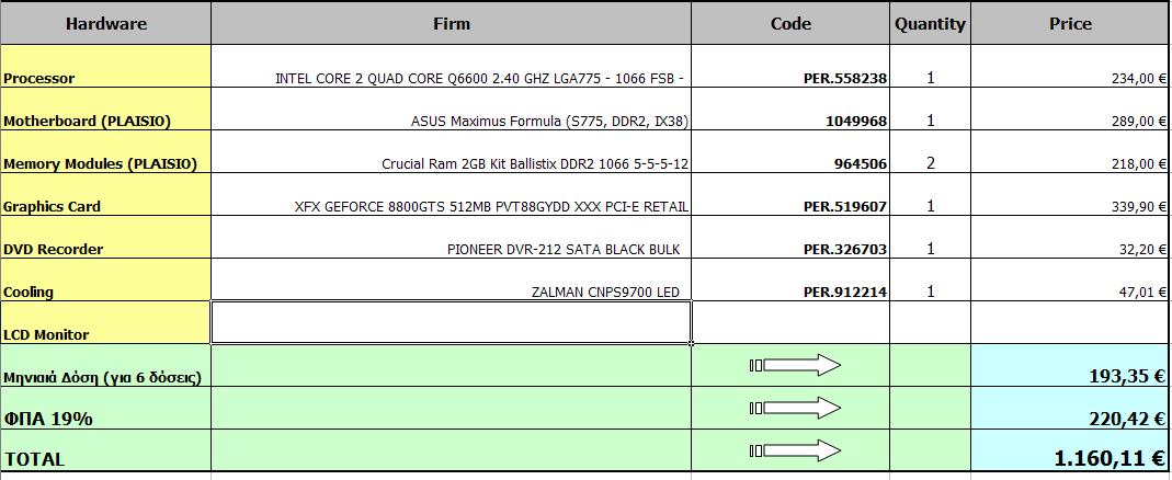 ultraxmode Δημοσ. 1 Φεβρουαρίου 2008 Δημοσ. 1 Φεβρουαρίου 2008 Παιδιά γειά σας, πιό κάτω έχω έναν πίνακα με τα πράγματα που θέλω να αγοράσω (τα υπόλοιπα που υπολείπονται τα έχω ήδη..) Τί λέτε ? Έχω κάνει καλές επιλογές ??? Είναι για 2 PC. Το δέυτερο είναι σύνθεση του ενός φίλου μου. Τί λέτε???