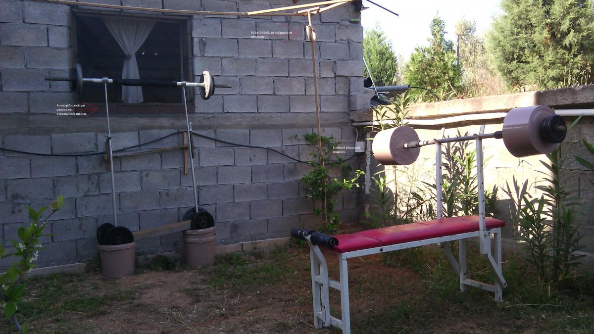 yannis27gr Δημοσ. 24 Μαΐου 2015 Δημοσ. 24 Μαΐου 2015 Το υπαίθριο γυμναστήριο. Πάνω δεξιά ψιλοφαίνεται το kettlebell που το έχω κρεμάσει να στεγνώσει, λες κι είναι σώβρακο, γιατί το ξαναέβαψα. Αριστερά το αυτοσχέδιο rack για στρατιωτικές πιέσεις/σκουοτ. Πάνω στον πάγκο ο σωλήνας με τα αυτοσχέδια/σταθερά κιλά από πλαστικούς κουβάδες με τσιμέντο. Ο σωλήνας είναι ενισχυμένος με ατσαλόβεργα εσωτερικά και υπάρχει αρκετός χώρος εκατέρωθεν ώστε να μπορούν να προστεθούν τουλάχιστον άλλοι 2 δίσκοι. Ο πάγκος είναι πάνω από 20 ετών. Καλά κρατιέται για την ηλικία του. Το καλό με τον συγκεκριμένο χώρο είναι πώς βρίσκετε πίσω από το σπίτι, στη δυτική πλευρά κι είναι εκτεθειμένο στο βορρά. Το πρωί δεν το βλέπει ο ήλιος* κι επιπλέον έχει, ακόμα και τις πιο ζεστές μέρες, ένα απαλό βοριαδάκι που το κάνει αρκετά δροσερό σημείο για πρωινές προπονήσεις. *Η φώτο είναι τραβηγμένη στις 10, όπου και φαινεται να έρχεται σιγά-σιγά ο ήλιος. Σε καμιά ώρα το καλύπτει και πλέον είναι σχεδόν αδύνατο να προπονηθείς, όποτε οι προπονήσεις τους επόμενους μήνες θα γίνονται μέχρι τις 9 - 9.30 μαξ. 17