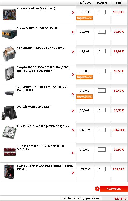 alexis333 Δημοσ. 24 Σεπτεμβρίου 2008 Δημοσ. 24 Σεπτεμβρίου 2008 Αυτα απο μενα. Mobo --> http://www.e-shop.gr/show_per.phtml?id=PER.522630 Ram --> http://www.e-shop.gr/show_per.phtml?id=PER.554017 HDD --> http://www.e-shop.gr/show_per.phtml?id=PER.303709 Cpu --> http://www.e-shop.gr/show_per.phtml?id=PER.558251 Vga --> http://www.e-shop.gr/show_per.phtml?id=PER.519013 Psu --> http://www.e-shop.gr/show_per.phtml?id=PER.650591 Case --> http://www.e-shop.gr/show_per.phtml?id=PER.700284 Dvd --> http://www.e-shop.gr/show_per.phtml?id=PER.305547 Συνολο --> 738.10 ? Μπορεις να πας και σε 4 giga ram βεβαια Το κουτι επισης ειναι γουστο του καθενος. Αρα αν σ'αρεσει καποιο αλλο χτυπα το.