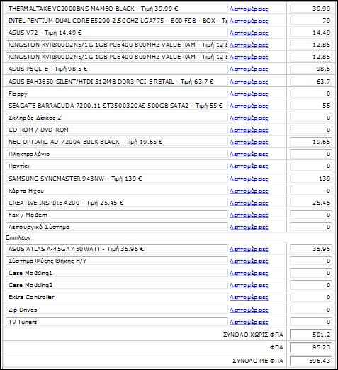 petros1815 Δημοσ. 18 Νοεμβρίου 2008 Δημοσ. 18 Νοεμβρίου 2008 Από e-shop.gr: ΚΑΤΗΓΟΡΙΑ ΤΙΤΛΟΣ ΤΙΜΗ ΠΟΣΟΤΗΤΑ ΣΥΝΟΛΟ ΚΟΥΤΙΑ - CASES (PER.806614) COOLERMASTER RC-332-KKP2 ELITE 332 BLACK 420WATT PSU 52.96 € Αλλαγή 52.96 € Διαγραφή ΕΠΕΞΕΡΓΑΣΤΗΣ - CPU (PER.558263) INTEL PENTIUM DUAL CORE E5200 2.50GHZ LGA775 - 800 FSB - BOX 79.00 € Αλλαγή 79.00 € Διαγραφή ΜΗΤΡΙΚΗ ΚΑΡΤΑ (PER.528436) ASROCK 4CORE1600-D800 41.90 € Αλλαγή 41.90 € Διαγραφή ΜΝΗΜΗ RAM (PER.554109) CRUCIAL CT2KIT12864AA667 2GB DUAL (2X1GB) PC5300 DDR2 667MHZ 24.50 € Αλλαγή 24.50 € Διαγραφή DVD RECORDER (PER.333153) SONY OPTIARC DVD-RW AD-5200S/BL SATA BLACK BULK 20.15 € Αλλαγή 20.15 € Διαγραφή ΣΚΛΗΡΟΣ ΔΙΣΚΟΣ (PER.305498) SAMSUNG HD321KJ 320GB SATA2 47.01 € Αλλαγή 47.01 € Διαγραφή ΟΘΟΝΗ (PER.169118) ASUS VW195D 19'' TFT 124.00 € Αλλαγή 124.00 € Διαγραφή ΚΑΡΤΑ ΓΡΑΦΙΚΩΝ (PER.510678) SAPPHIRE RADEON HD3850 512MB DUAL SLOT PCI-E RETAIL 85.89 € Αλλαγή 85.89 € Διαγραφή ΠΛΗΚΤΡΟΛΟΓΙΟ (PER.576543) GIGABYTE GK-KM6100 ULTRA-SLIM MULTIMEDIA DESKTOP 9.89 € Αλλαγή 9.89 € Διαγραφή ΗΧΕΙΑ (PER.501676) LOGITECH LS11 17.99 € Αλλαγή 17.99 € Διαγραφή Αξία προϊόντων: 503.29 € Διαγραφή όλων