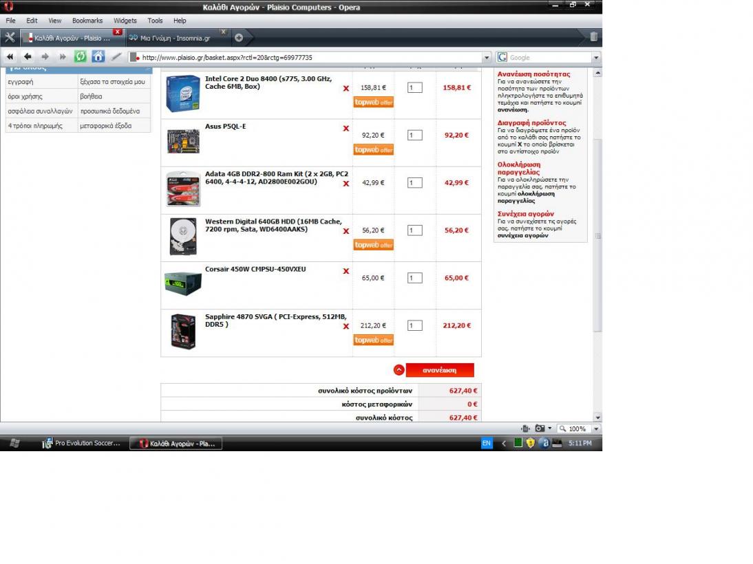PETERANOS Δημοσ. 24 Δεκεμβρίου 2008 Δημοσ. 24 Δεκεμβρίου 2008 Μια πρόταση από έμενα Τροφοδοτικό: Corsair 550W CMPSU-550VXEU 81,00 Επεξεργαστής: Intel Core 2 Duo 8400 (s775, 3.00 GHz, Cache 6MB, Box) 158,81 Μητρική: Asus P5QL-E 92,20 Ram: Adata 4GB DDR2-800 Ram Kit (2 x 2GB, PC2 6400, 4-4-4-12, AD2800E002GOU) 43,00 Κάρτα γραφικών: Sapphire 4870 SVGA ( PCI-Express, 512MB, DDR5 ) 212,20 Σύνολο 587,21€
