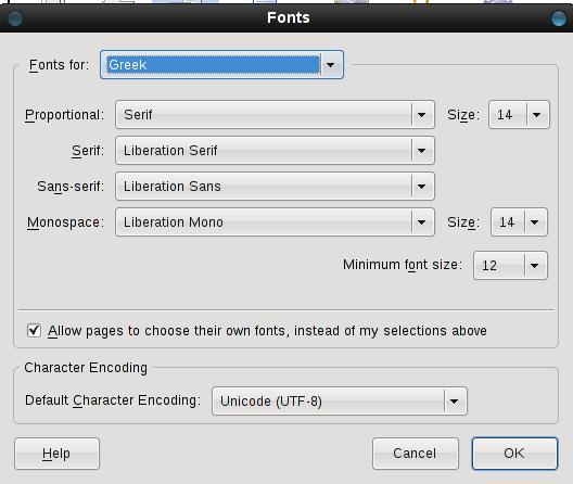 nske Δημοσ. 27 Ιουνίου 2009 Δημοσ. 27 Ιουνίου 2009 Το προφιλ του firefox είναι αντίγραφο εκείνου που χρησιμοποιούσα στο ubuntu χωρίς κανένα πρόβλημα. Αν δημιουργήσεις ένα νέο προφίλ; Έχω δοκιμάσει να αλλάξω αρκετές γραμματοσειρές, αλλά φαίνεται σαν να μην επηρεάζουν οι αλλαγές μου το αποτέλεσμα... - Έχεις προσέξει το menu "Fonts for:" όταν επιλέγεις γραμματοσειρά, έτσι; Ο Firefox έχει διαφορετικές ρυθμίσεις γραμματοσειρών για κάθε αλφάβητο. - Tο check-box "Allow pages to choose their own fonts, ..." κάνει κάποια διαφορά;
