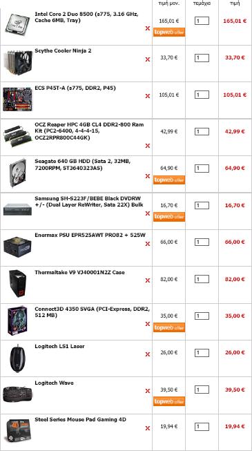 NOPSTRIM Δημοσ. 9 Μαρτίου 2009 Δημοσ. 9 Μαρτίου 2009 Γεια σας! Λοιπόν έχουμε και λέμε... Το παρακάτω PC προορίζεται για γραφείο, θα το χρησιμοποιώ εγώ στην δουλειά μου... Πάρα πολύ office, αρκετό autocad (δεν θα δημιουργώ αρχεία, απλά θα βλέπω έτοιμα projects), λίγο photoshop (πάλι για projects) Επίσης ερώτηση, θα μπούνε Windows 7 μέχρι να βγουν, μπορώ να βάλω την beta έκδοση; η είναι μόνο για home users; Δεν πιστεύω να έχω τίποτα τρεχάματα με την beta;;; Σύνολο: 696,75 €