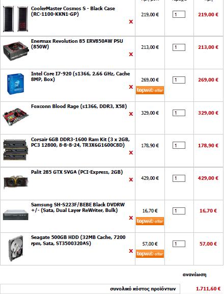 NOPSTRIM Δημοσ. 12 Μαρτίου 2009 Δημοσ. 12 Μαρτίου 2009 Πως σας φαίνεται; Σε κάτι κατώτερο δεν πάω... Θα μπει μάλλον σε μια 26"-27" Θα αντεπεξέλθει η κάρτα; Προορίζεται για hardcore gaming και πάρα πολλά benches... και εννοείτε o/cs το μόνο που με χαλάει είναι ότι θα μείνω με μαμά ψήκτρα γιατί λέω να μην ξανά πάω σε αέρα και να μαζέψω κατευθείαν για νερό... Δεν έχω ξεχάσει κάτι;